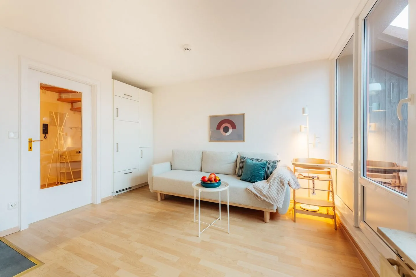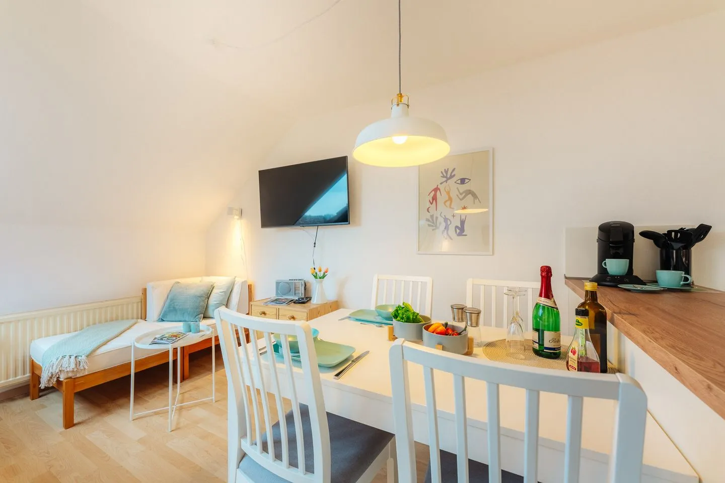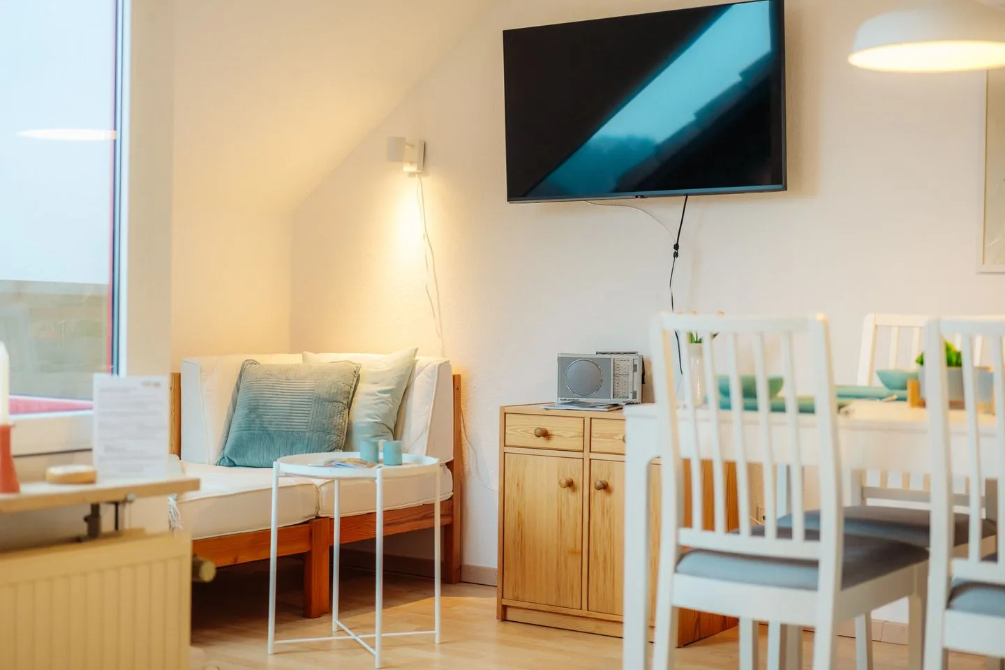 Helles Wohnzimmer mit Schlafcouch, Smart-TV und Essbereich