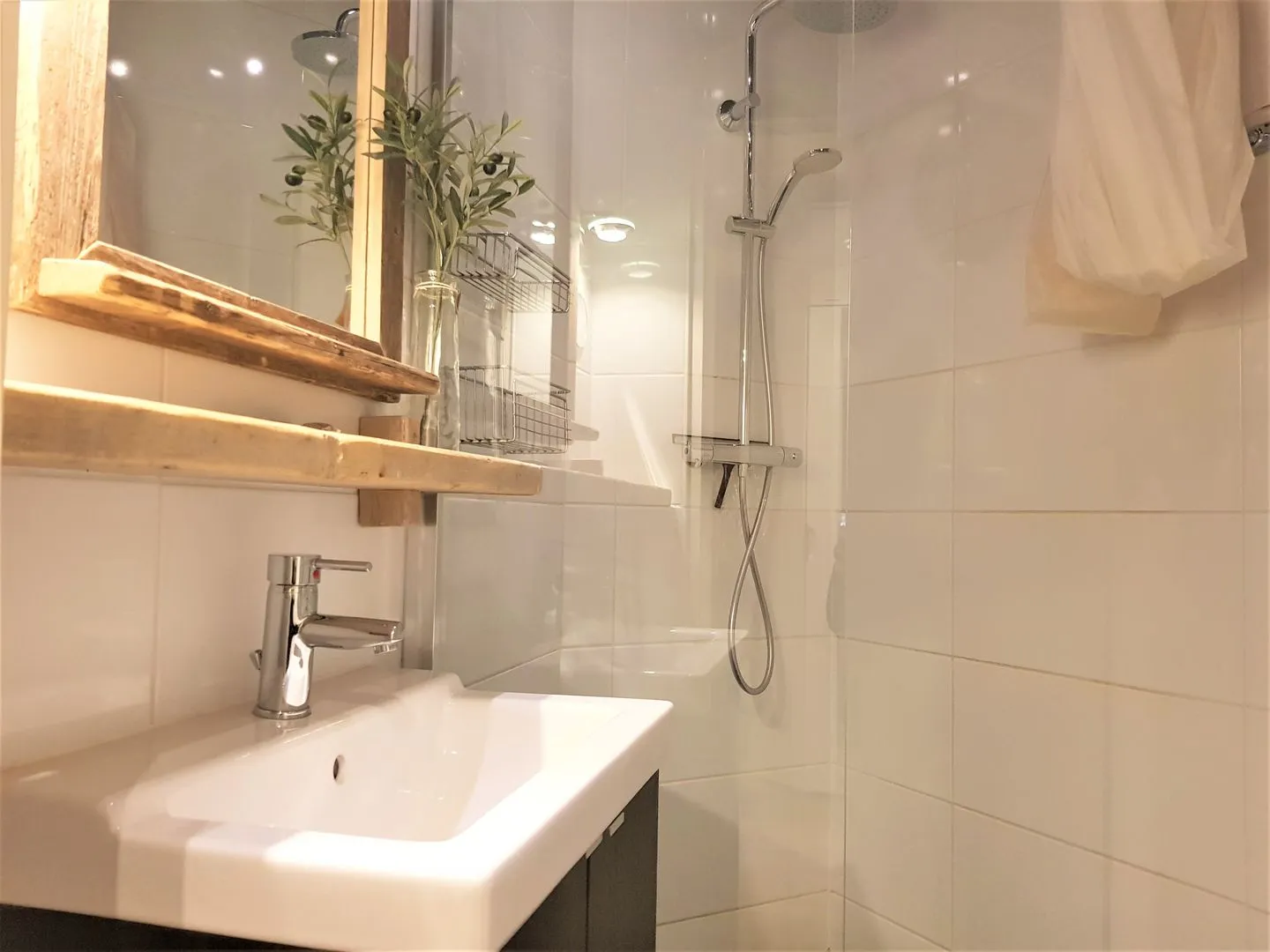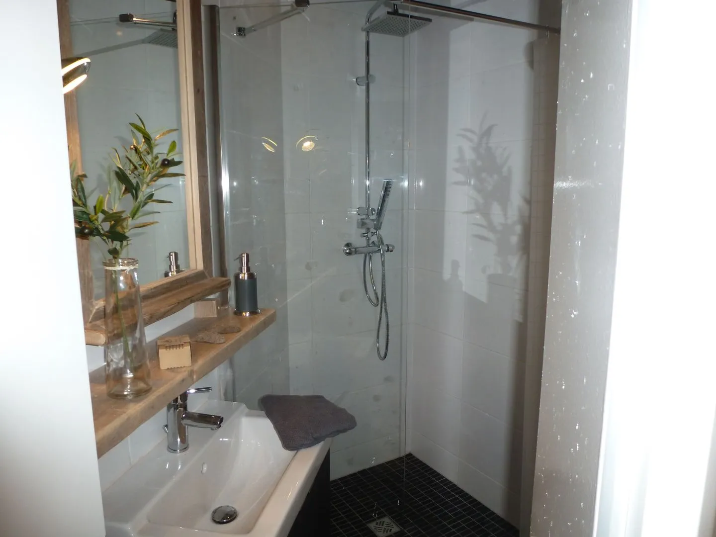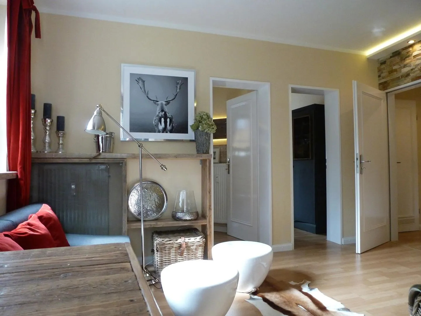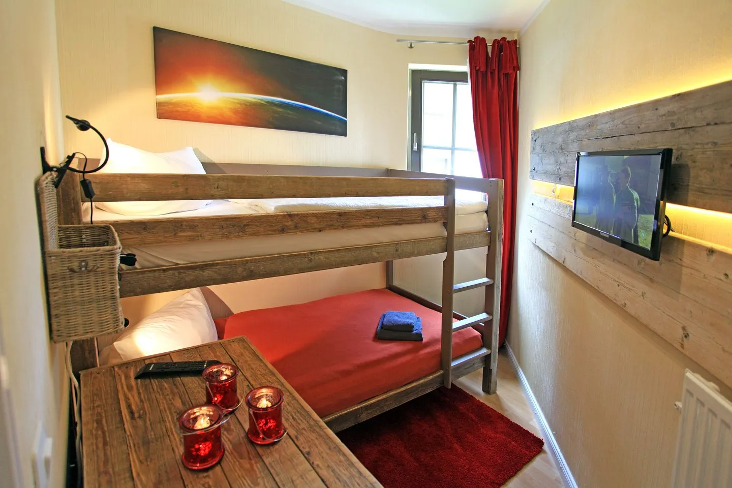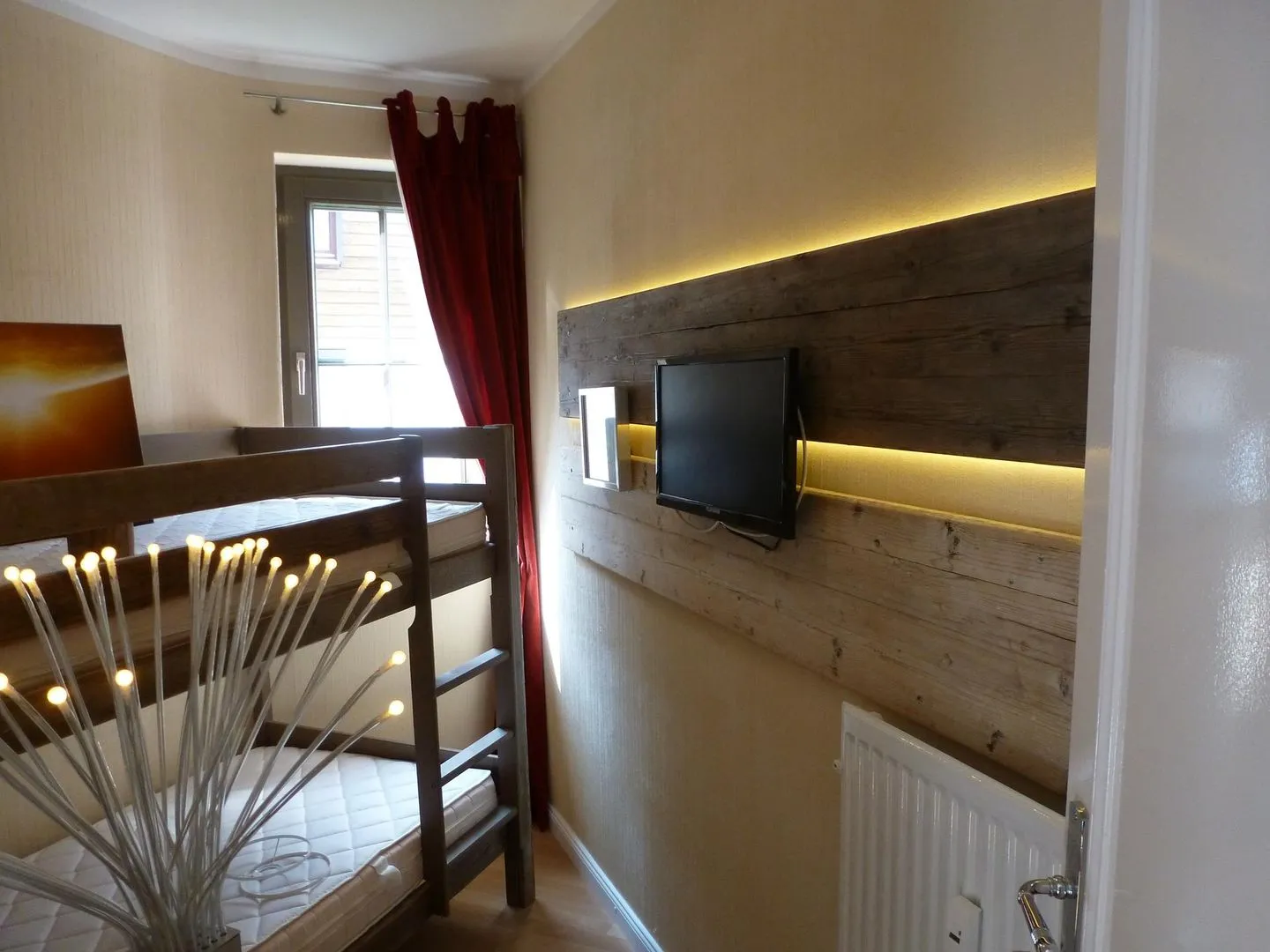 Der Wohnbereich lädt mit einer bequemen Sitzcouch und einem TV zum Entspannen ein. Die angrenzende, kleine, aber voll ausgestattete Küchenzeile bietet alles für eine komfortable Selbstverpflegung. Das große Schlafzimmer ist mit einem Doppelbett ausgestattet, während das kleine Kinderschlafzimmer mit einem Etagenbett ideal für den Nachwuchs ist. Die Fernseher in den Schlafzimmern sind ausschließlich für externe Geräte nutzbar. Das moderne Duschbad ist geräumig und stilvoll gestaltet.