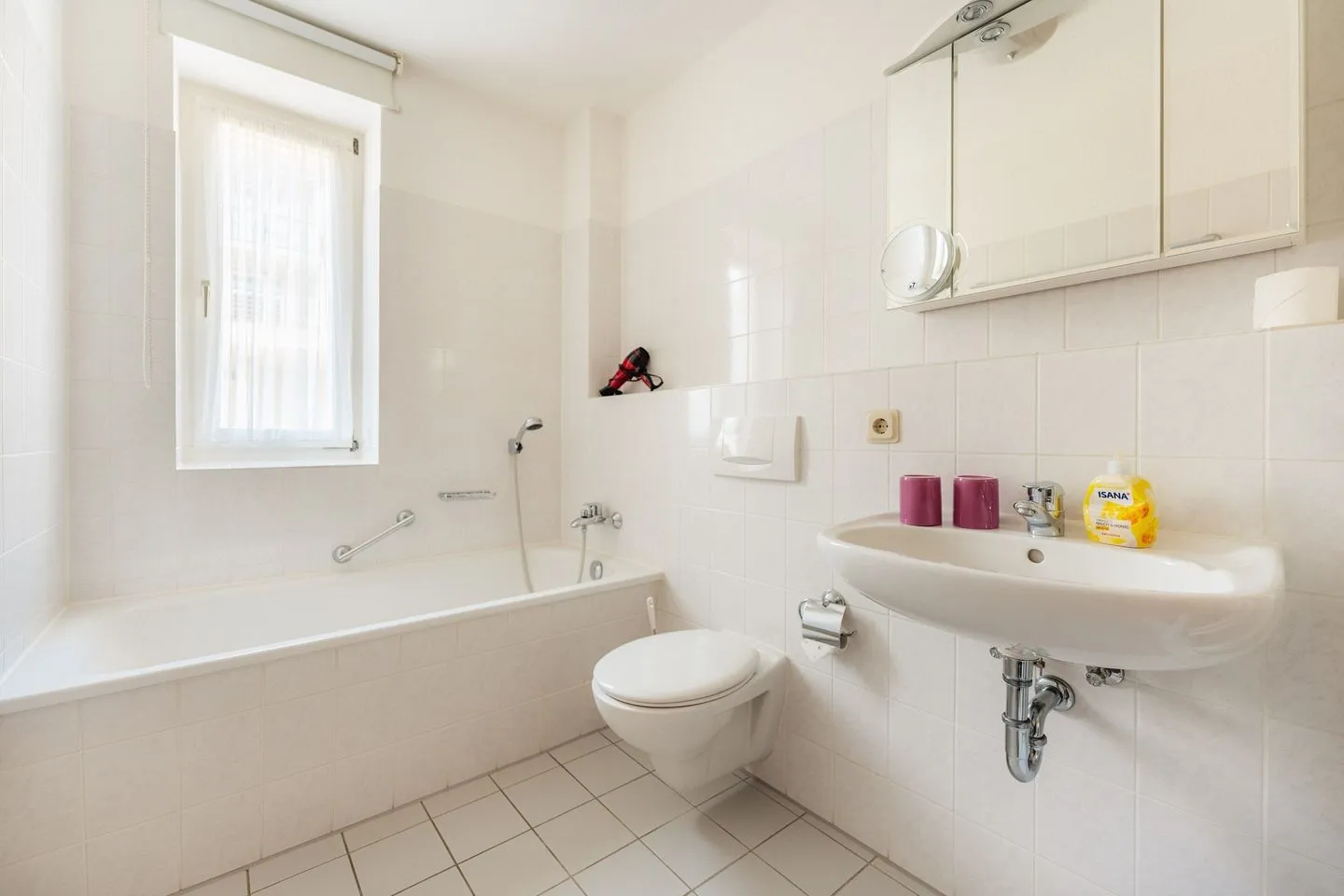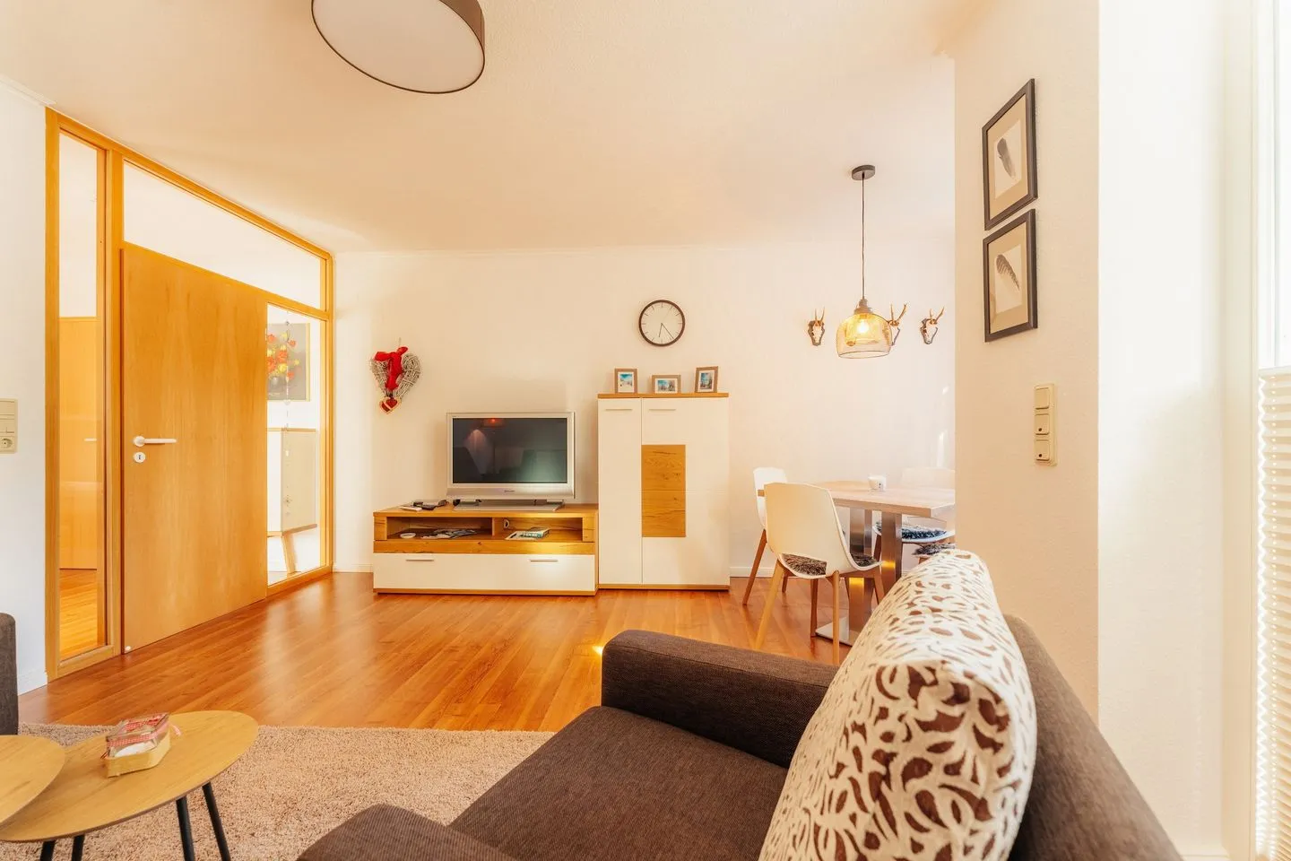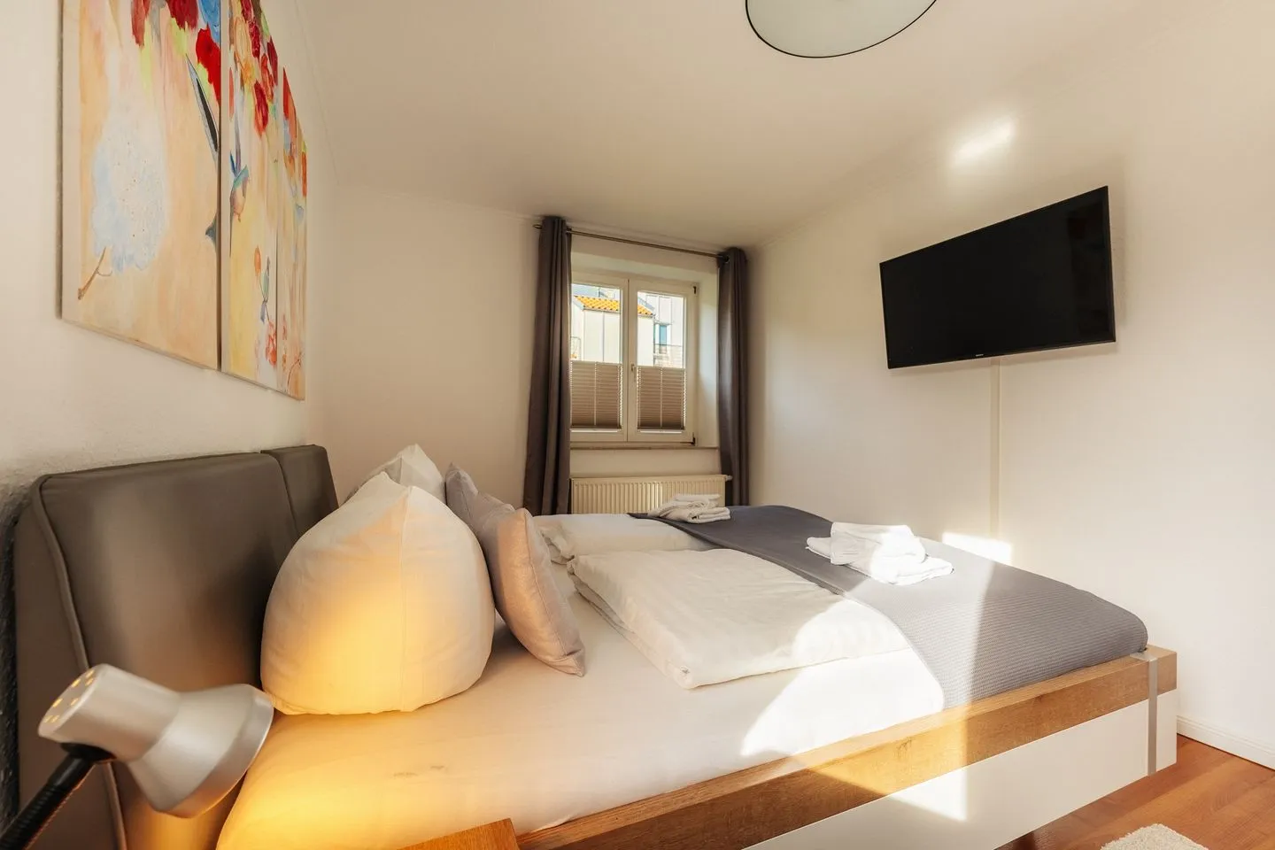 Der gemütliche Wohnbereich lädt mit Schlafcouch, Esstisch und TV zum Verweilen ein. Die voll ausgestattete Küche mit Geschirrspüler macht das Kochen besonders angenehm. Im Schlafzimmer erwartet Sie ein komfortables Doppelbett mit eigenem TV. Das große Badezimmer bietet mit Badewanne und separater Dusche puren Wellnesskomfort.