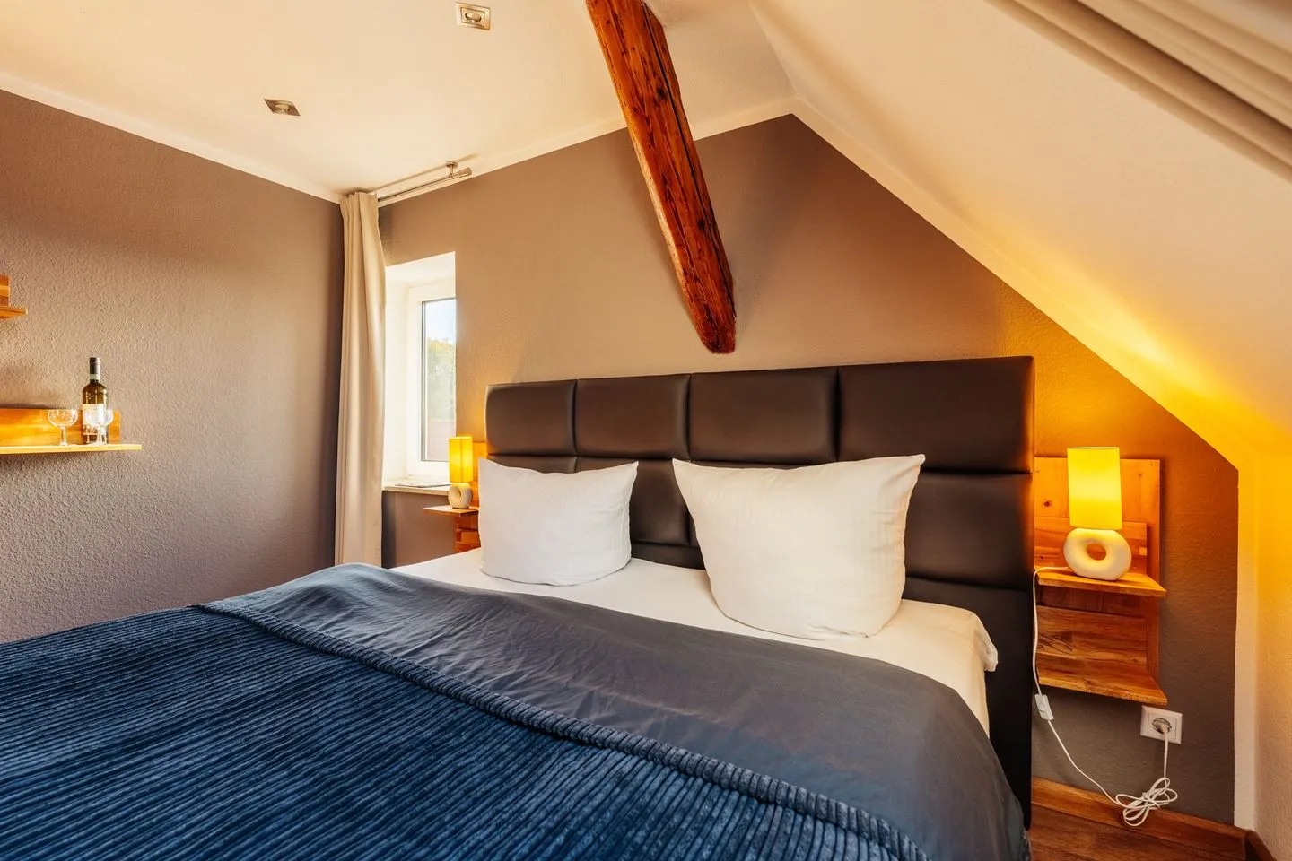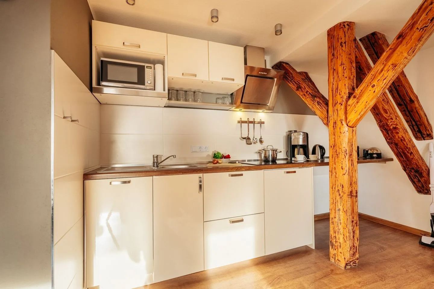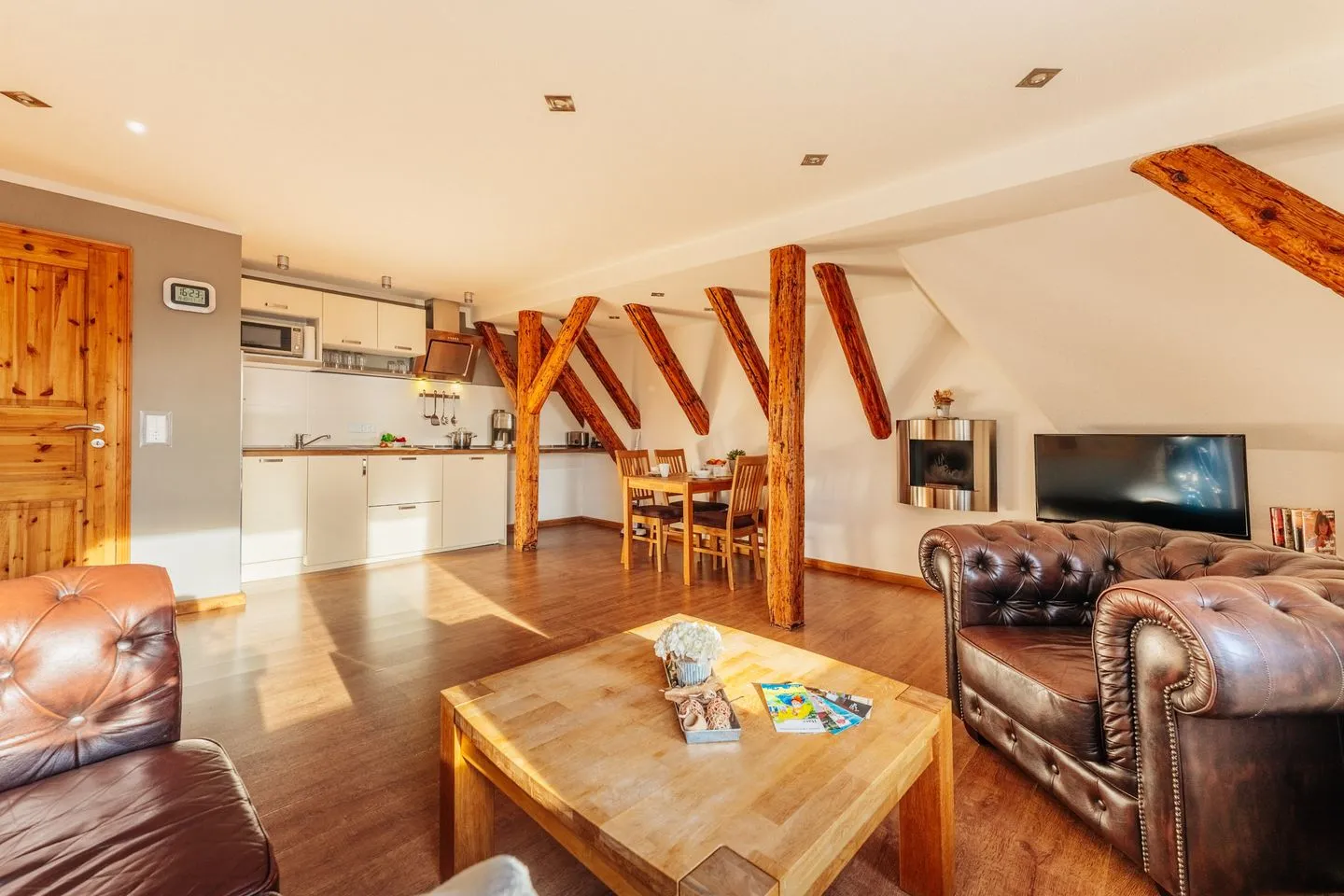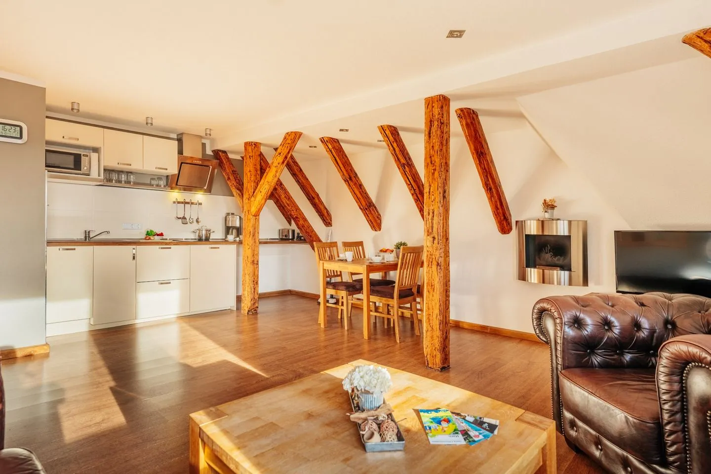 Das geräumige Wohnzimmer lädt mit bequemem Sofa, Smart-TV und einem romantischen Ethanol-Kamin zu gemütlichen Stunden ein. Die angrenzende, voll ausgestattete Küchenzeile mit Esstisch ist ideal für gemeinsame Mahlzeiten. Im Schlafzimmer sorgt ein hochwertiges Boxspring-Doppelbett für erholsame Nächte. Das moderne Badezimmer verfügt über eine komfortable Dusche und eine eigene Waschmaschine für längere Aufenthalte.