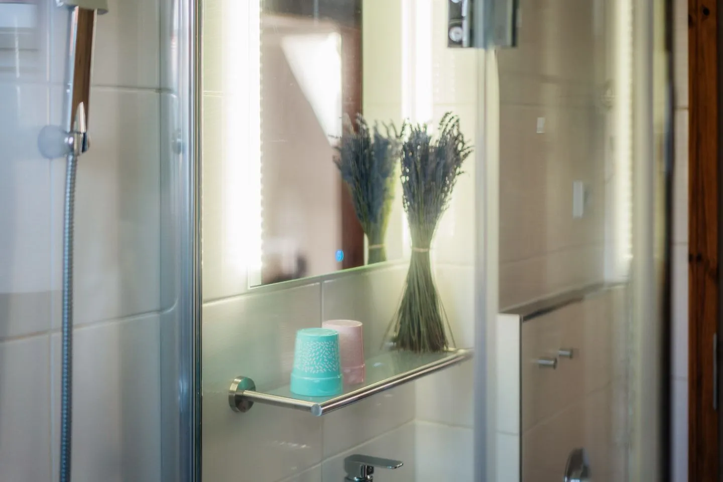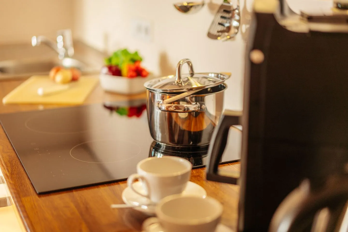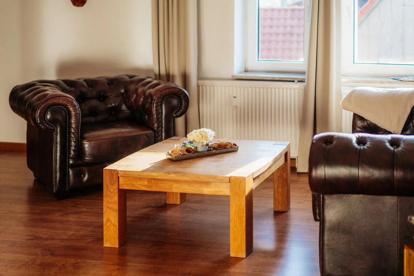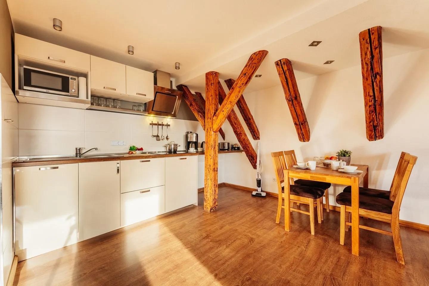 Das geräumige Wohnzimmer lädt mit bequemem Sofa, Smart-TV und einem romantischen Ethanol-Kamin zu gemütlichen Stunden ein. Die angrenzende, voll ausgestattete Küchenzeile mit Esstisch ist ideal für gemeinsame Mahlzeiten. Im Schlafzimmer sorgt ein hochwertiges Boxspring-Doppelbett für erholsame Nächte. Das moderne Badezimmer verfügt über eine komfortable Dusche und eine eigene Waschmaschine für längere Aufenthalte.