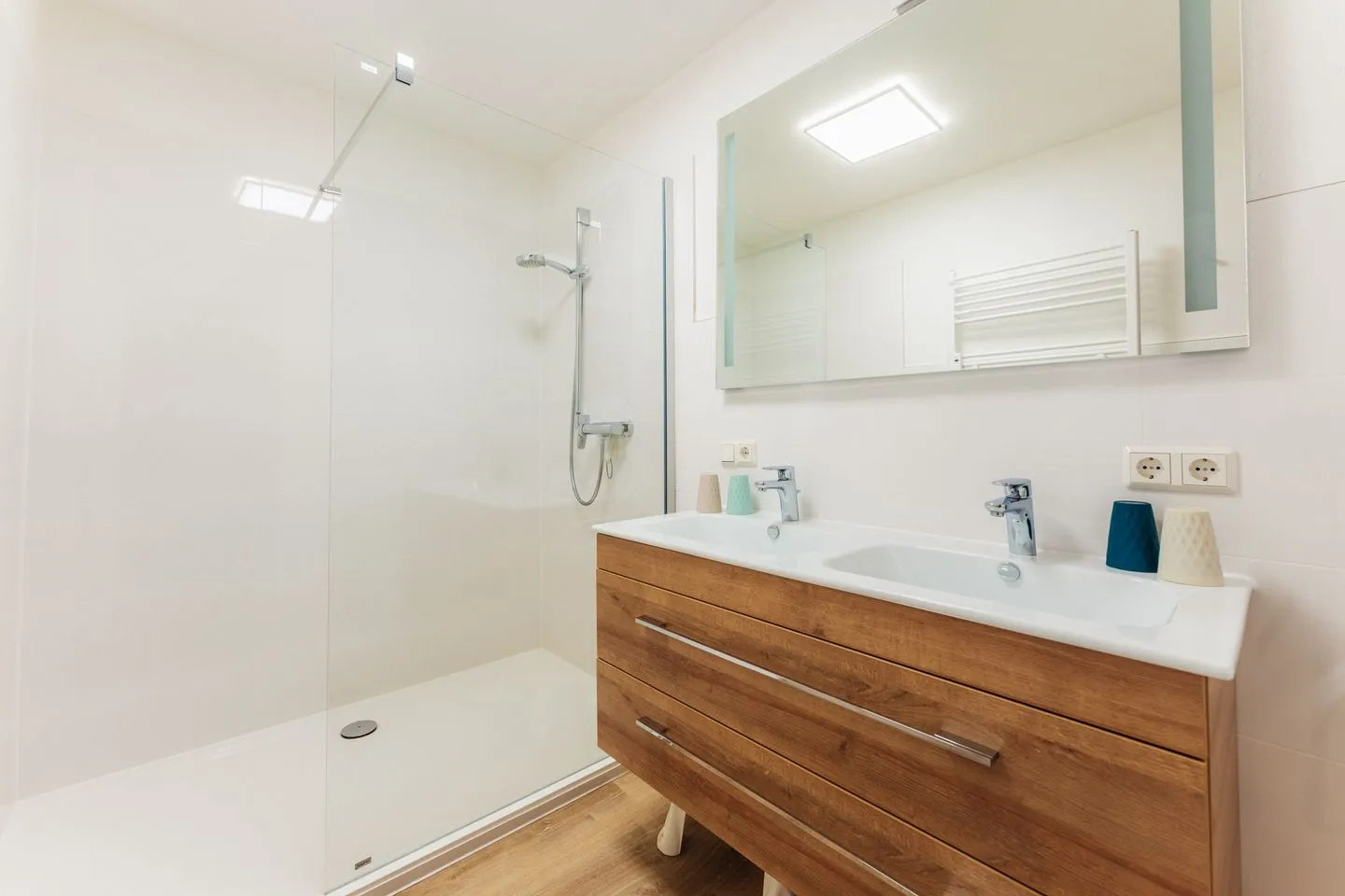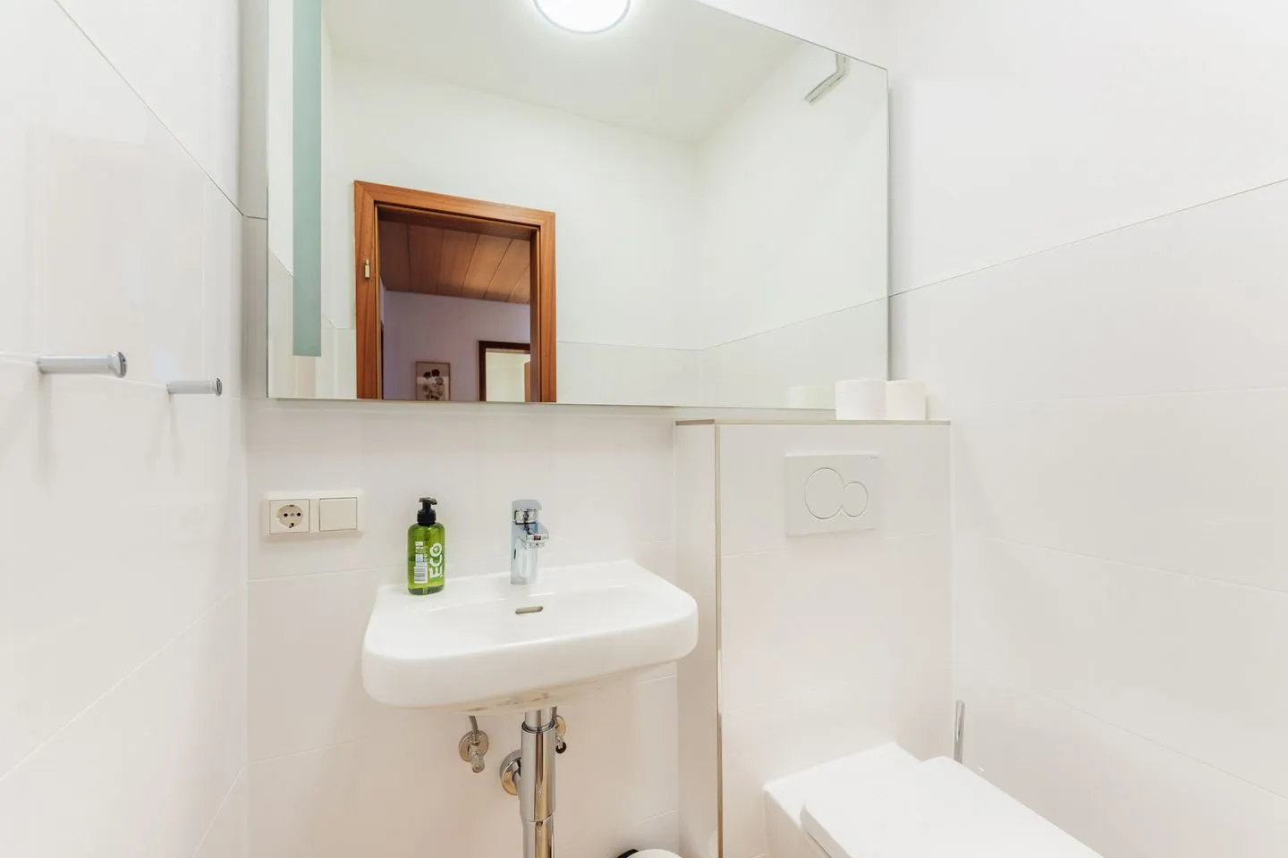 Das gemütliche Schlafzimmer verspricht erholsamen Schlaf. Das moderne Badezimmer mit bodengleicher Dusche und Badewanne sorgt für pure Entspannung. Ein zusätzliches Gäste-WC erhöht den Komfort.