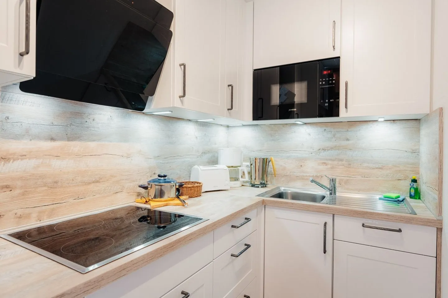 Der Wohnbereich lädt mit bequemer Couch, Sessel und Esstisch zu entspannten Stunden ein. Smart-TV, WLAN sowie eine CD- & Radioanlage sorgen für beste Unterhaltung. Die moderne, voll ausgestattete Küche bietet alles, was Sie brauchen – Ceranfeldherd, Backofen, Mikrowelle, Kühlschrank mit Gefrierfach, Spülmaschine und viele praktische Küchenutensilien.