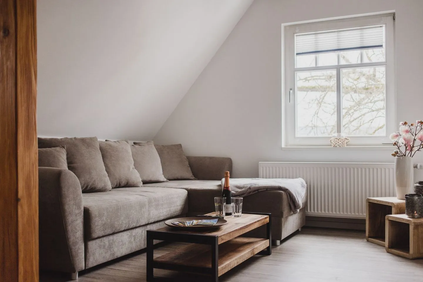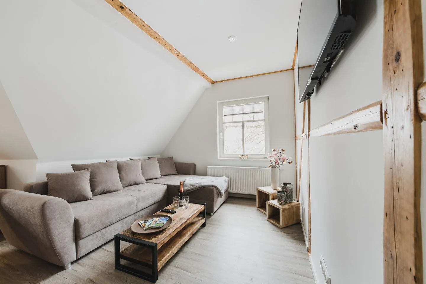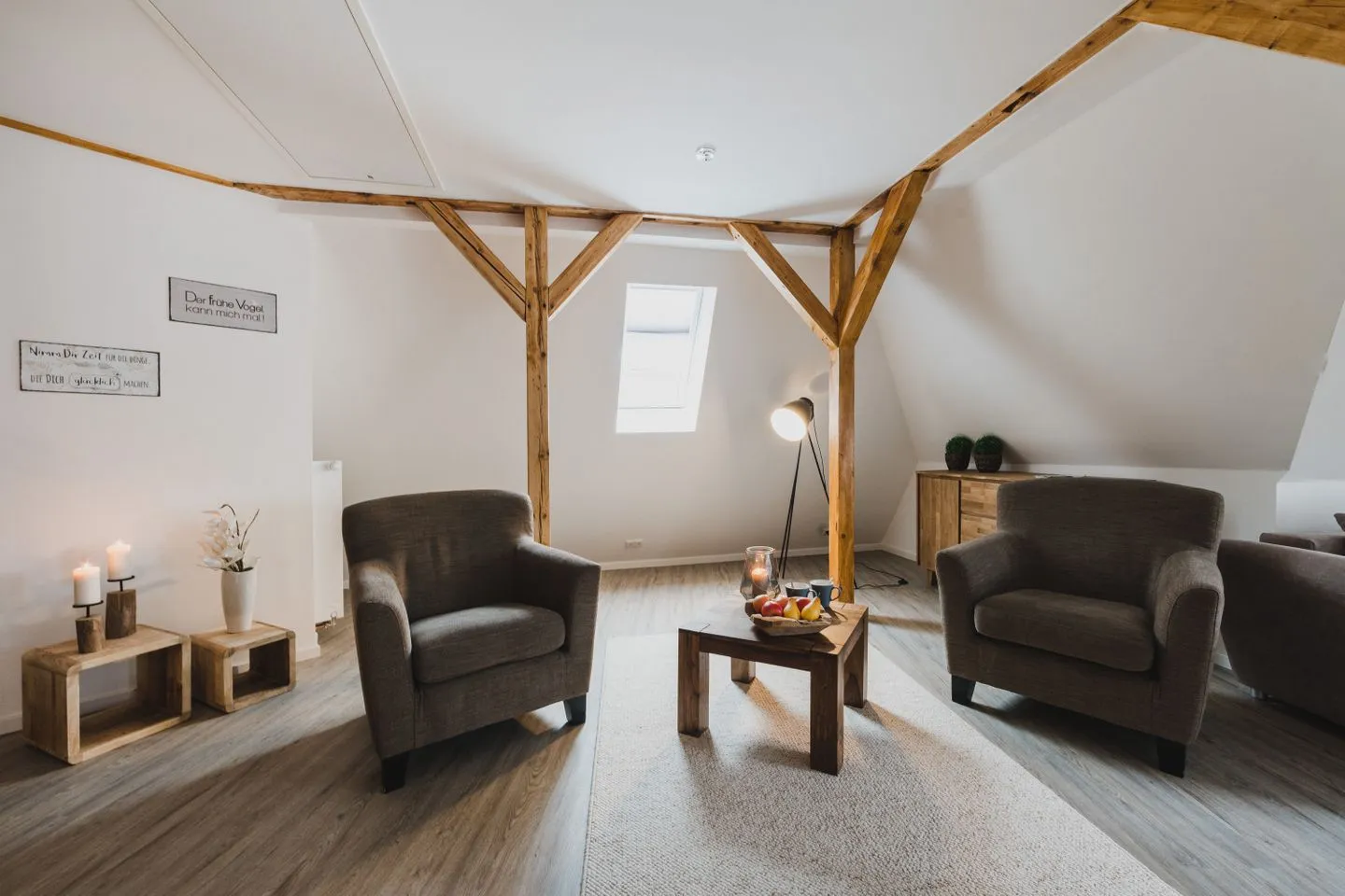 Der gemütliche Wohnbereich mit TV, Esstisch und Leseecke lädt zum Entspannen ein. Die voll ausgestattete Küche befindet sich in der unteren Etage. In der Dachgeschosswohnung ist die frühere Küche nicht mehr nutzbar – die vorhandenen Schränke dienen ausschließlich als Stauraum.