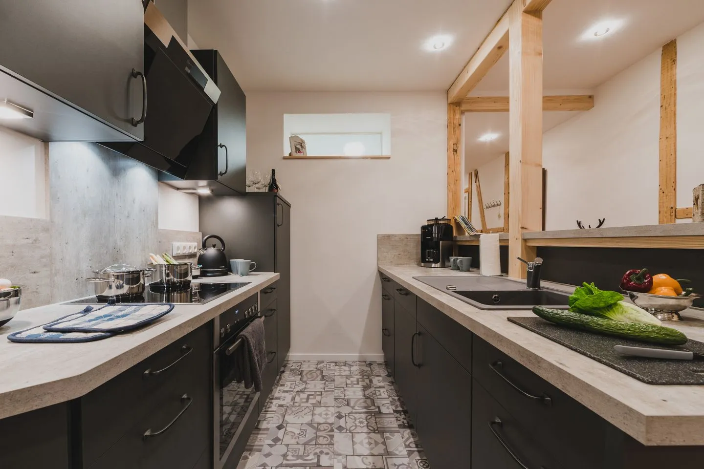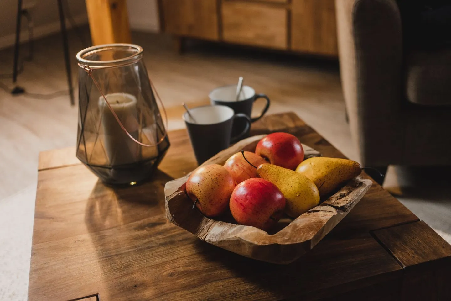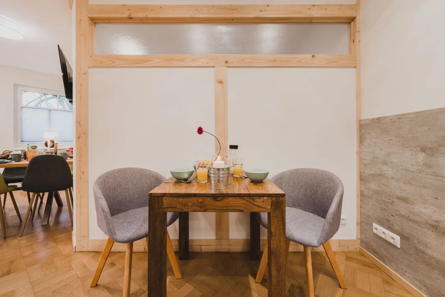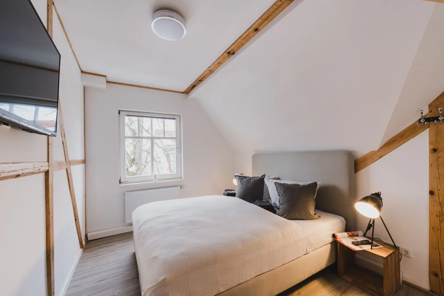 Der gemütliche Wohnbereich mit TV, Esstisch und Leseecke lädt zum Entspannen ein. Die voll ausgestattete Küche befindet sich in der unteren Etage. In der Dachgeschosswohnung ist die frühere Küche nicht mehr nutzbar – die vorhandenen Schränke dienen ausschließlich als Stauraum.