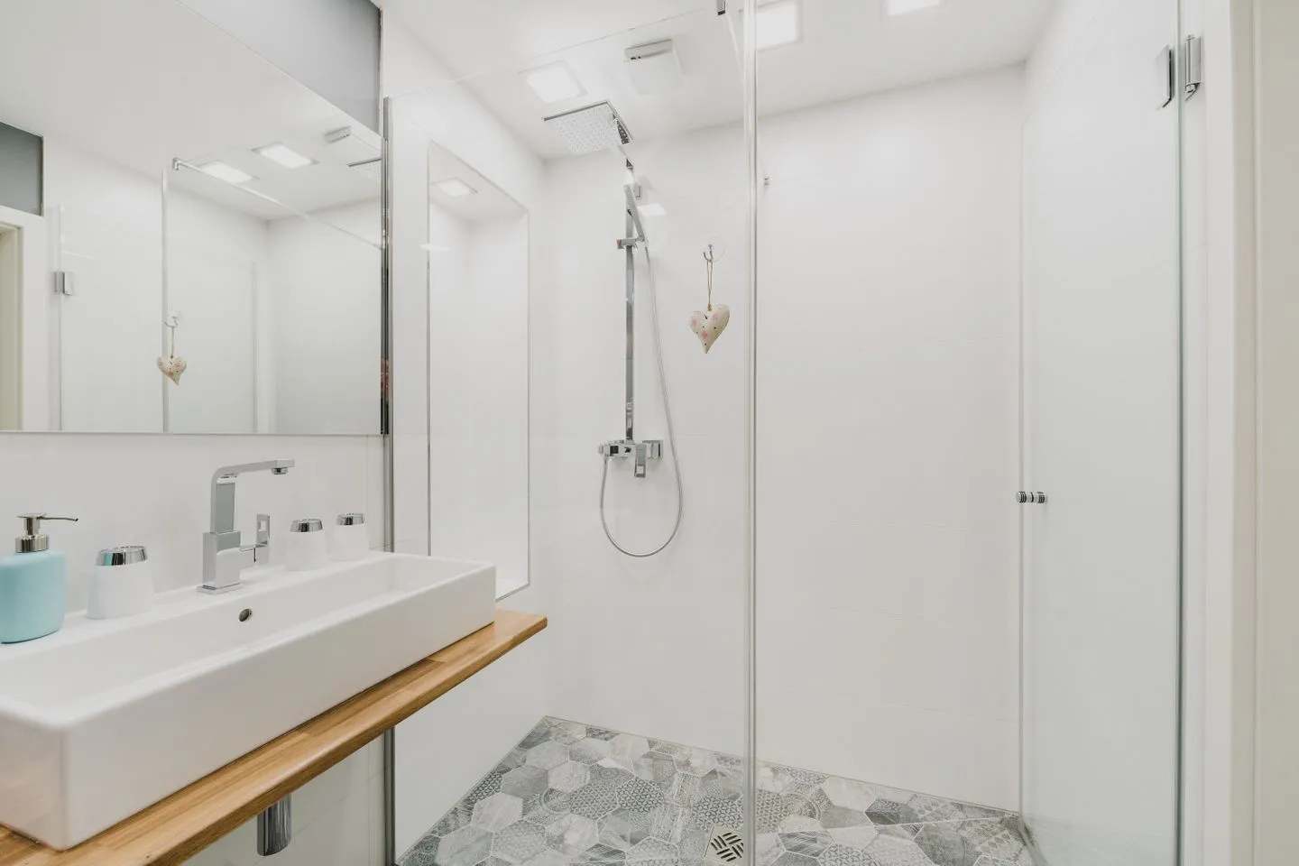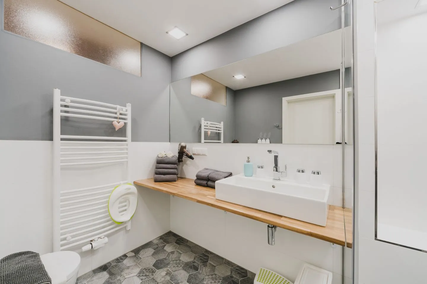 Auf zwei Etagen bietet die Ferienwohnung 5 Schlafzimmer: vier mit Doppelbetten (180×200 & 160×200 cm) sowie ein kleines fünftes Schlafzimmer (140×200 cm), das über ein anderes Zimmer erreichbar ist. Zusätzlich steht eine Schlafcouch im oberen Wohnbereich zur Verfügung. Zwei moderne Duschbäder sorgen für Komfort.