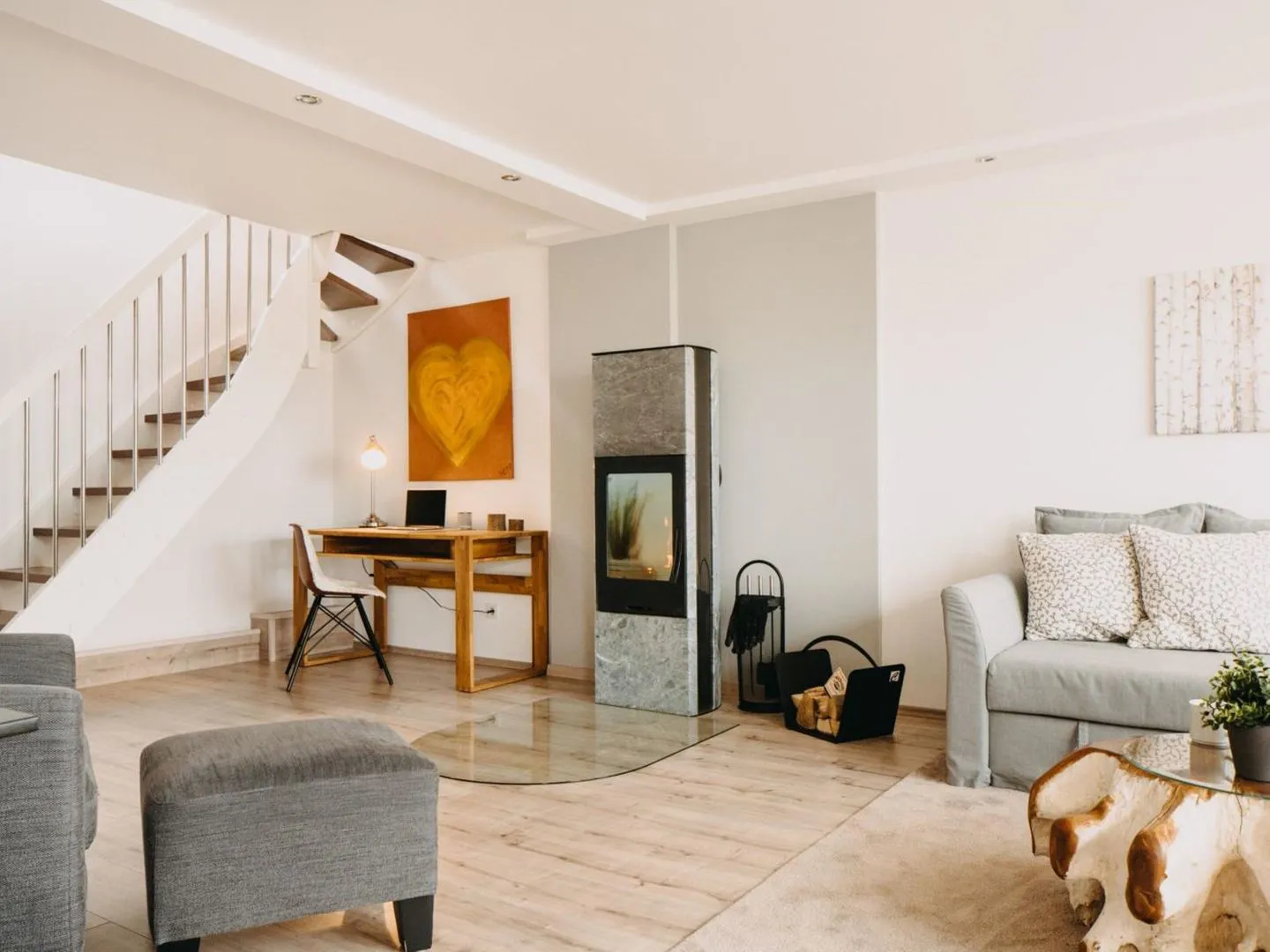 Der großzügige Wohnbereich mit Kamin sorgt für eine besonders gemütliche Atmosphäre, perfekt für entspannte Abende nach einem aktiven Tag im Harz.