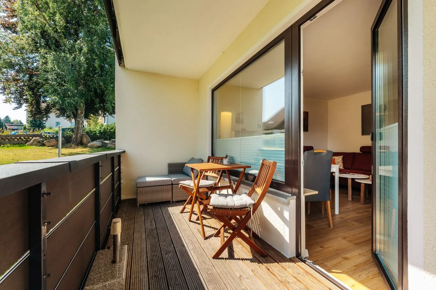 Der Außenbereich bietet einen Balkon mit Gartenmöbeln, Sonnenschirm und herrlicher Aussicht.