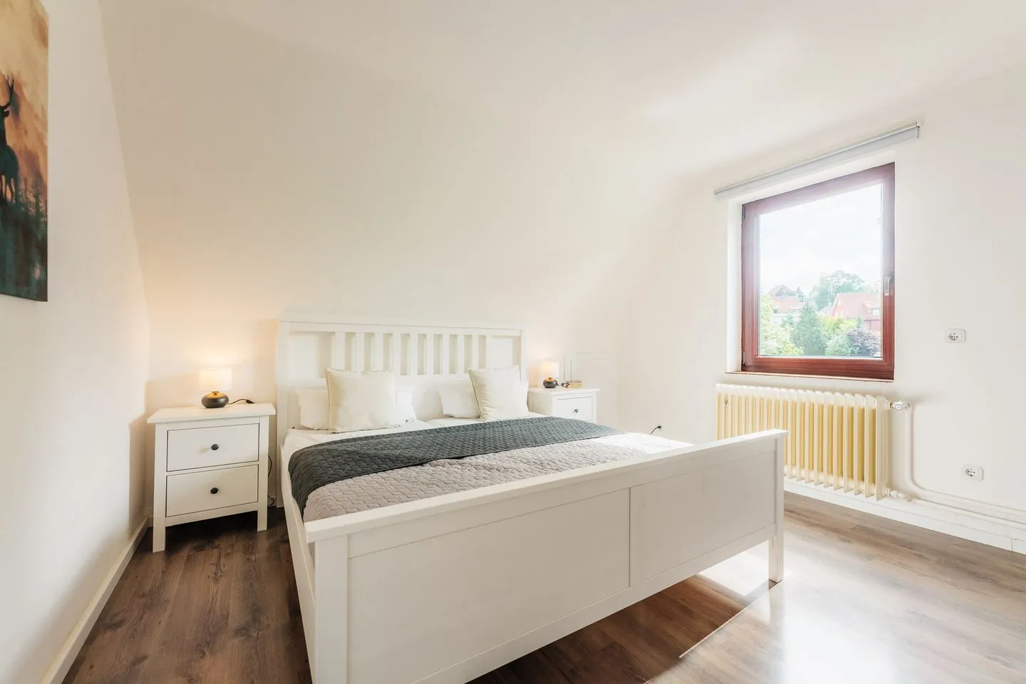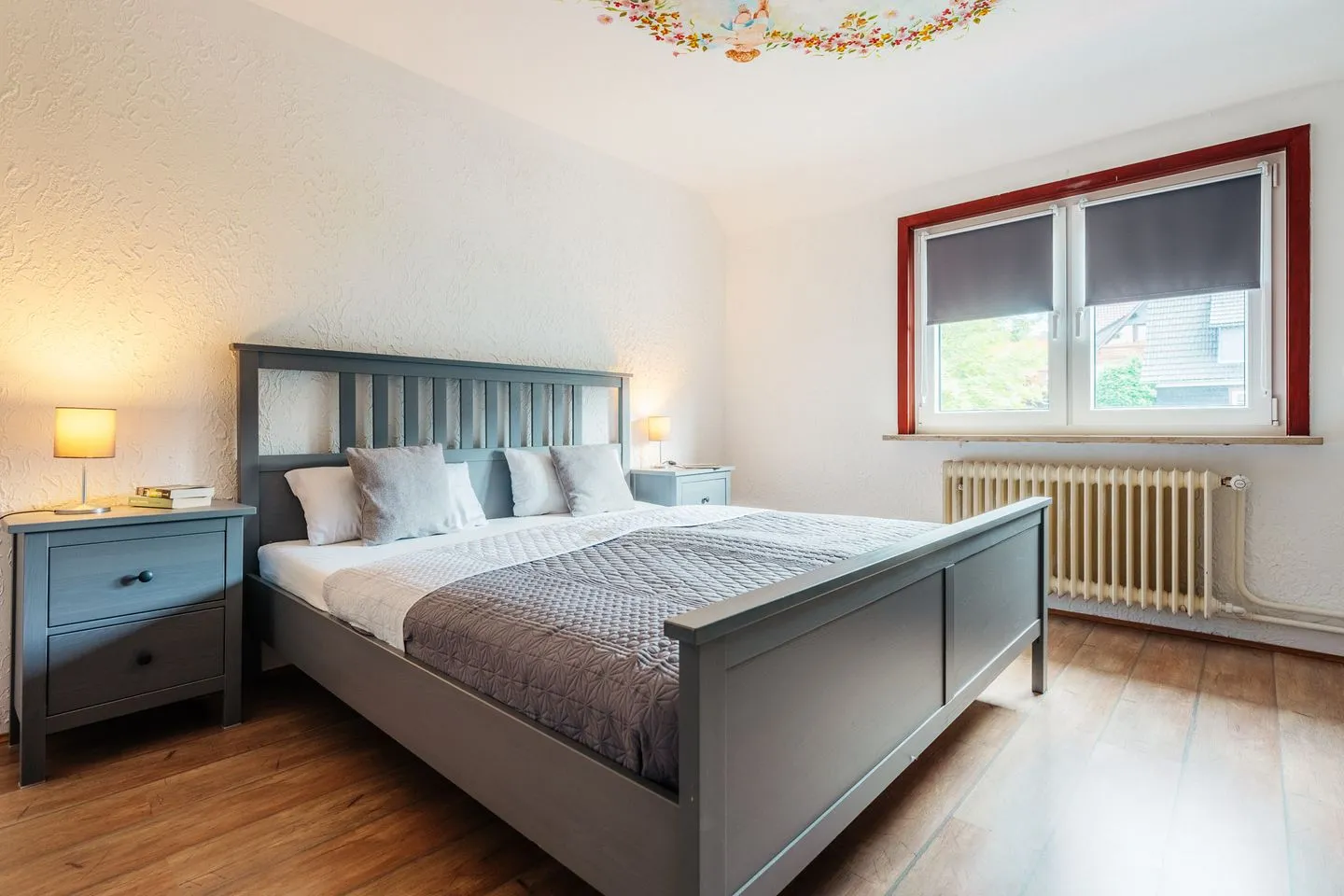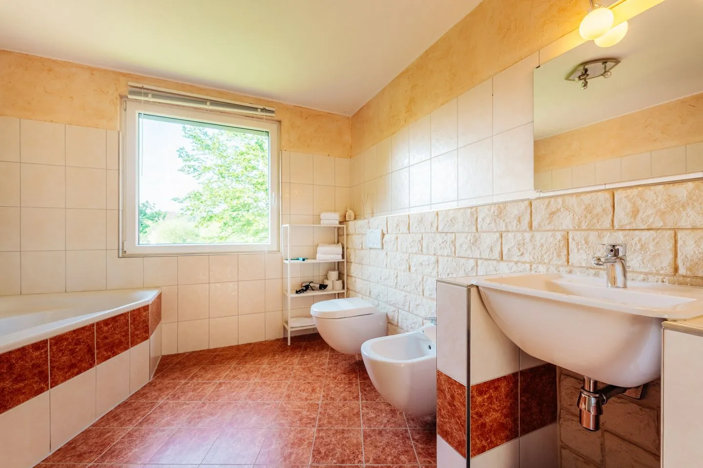 Es stehen zwei Schlafzimmer mit Doppelbetten sowie ein Durchgangszimmer mit zwei Einzelbetten zur Verfügung – ideal für Kinder. Das große Badezimmer mit Dusche und Badewanne sowie ein zusätzliches Gäste-WC sorgen für Komfort im Alltag.