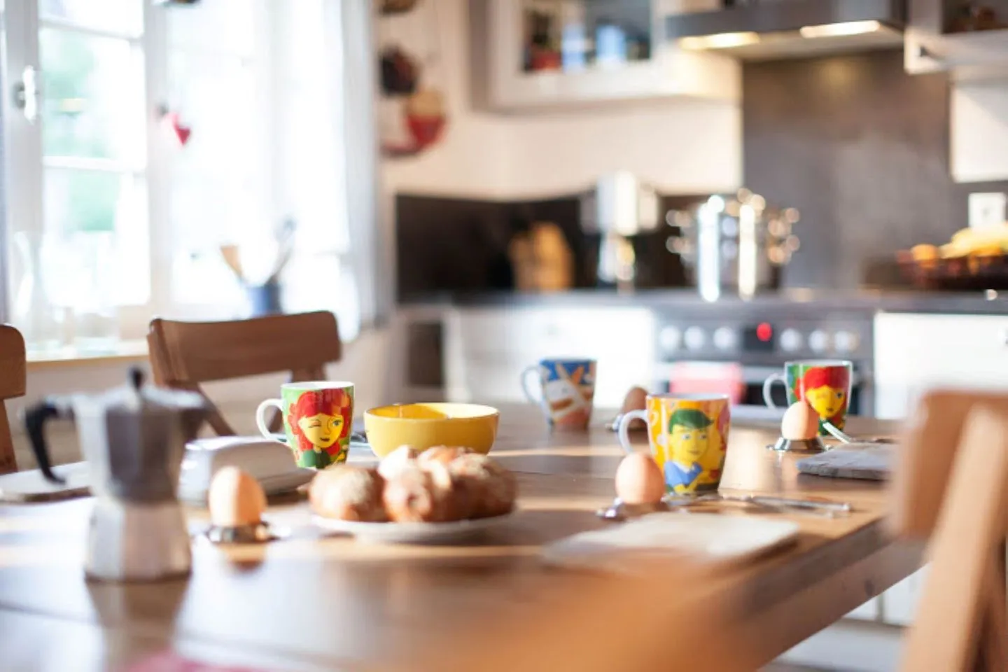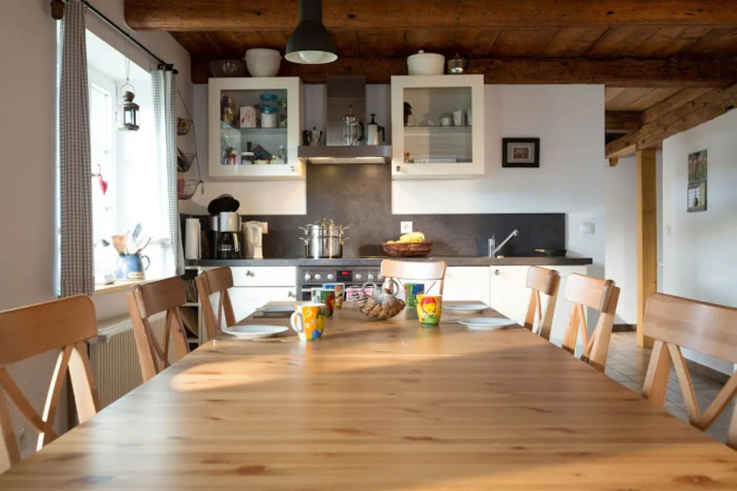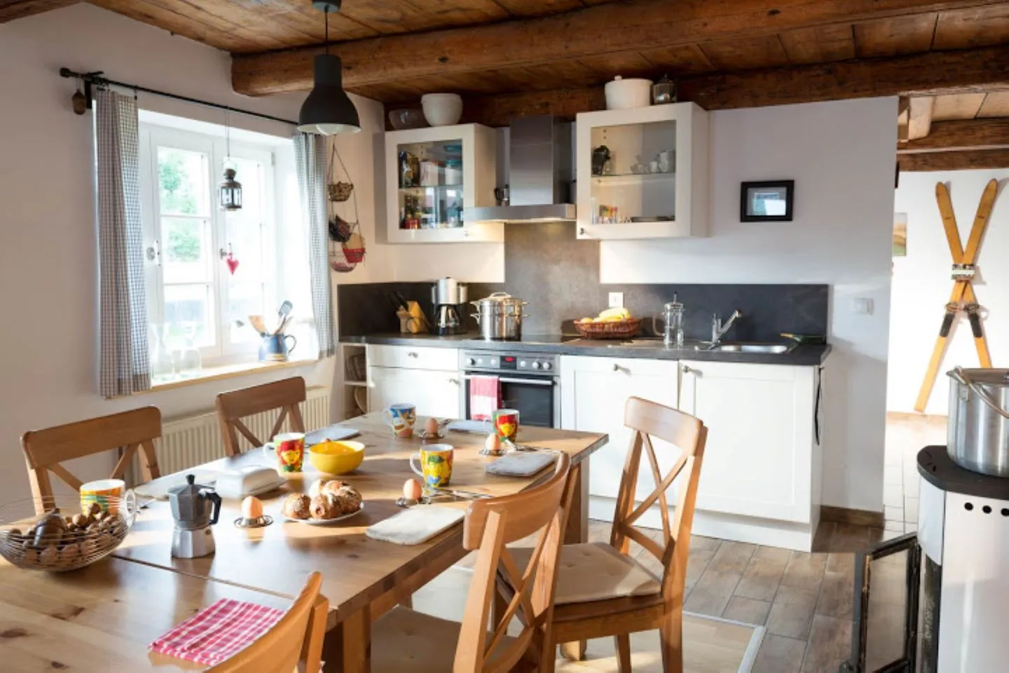 Der gemütliche Wohnbereich lädt mit Kaminofen und Flachbild-TV zu entspannten Abenden ein. Die voll ausgestattete Küche mit großem Esstisch für bis zu 12 Personen macht gemeinsames Kochen und Essen zum Erlebnis.