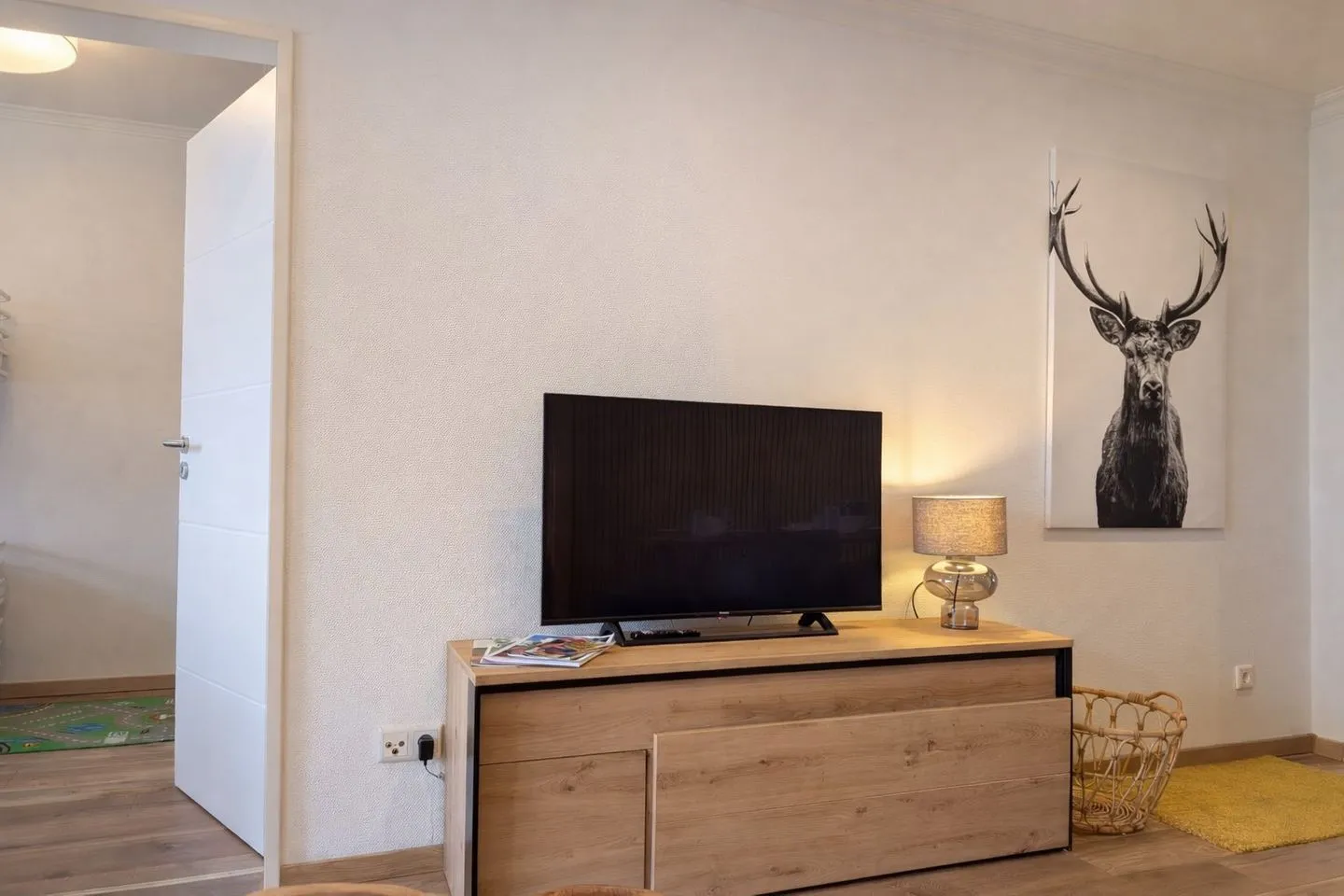Der offene Wohnbereich mit gemütlicher Couch, Essplatz und TV lädt zum Abschalten ein. Große Fenster sorgen für viel Tageslicht und eine angenehme Atmosphäre.
